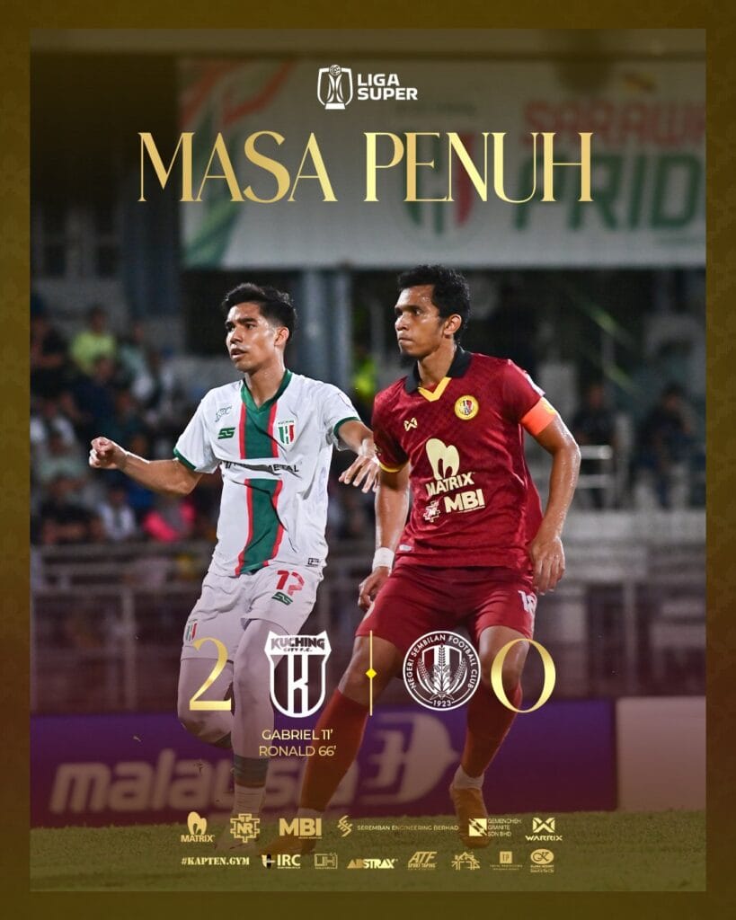 Negeri Sembilan started brightly and mounted several attacking moves in the opening stages. However, a costly defensive error in the 10th minute proved decisive when defender Amirul Adli Azmi’s misplaced back pass was intercepted by Gabriel Nistelrooy Tamin, who calmly finished to give Kuching City the lead.