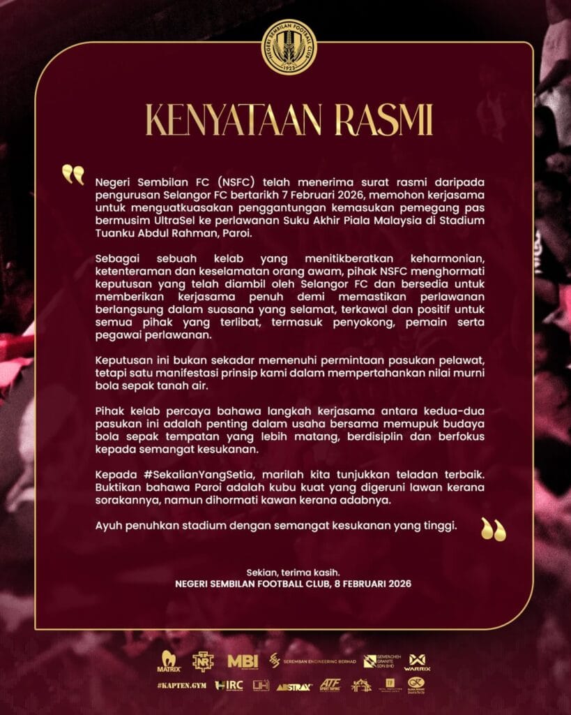 Negeri Sembilan FC (NSFC) has issued an official statement following the receipt of a formal request from Selangor FC, dated 7 February 2026, concerning matchday security arrangements for the upcoming Malaysia Cup quarter-final at Stadium Tuanku Abdul Rahman.